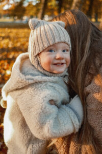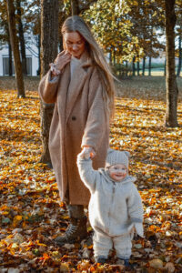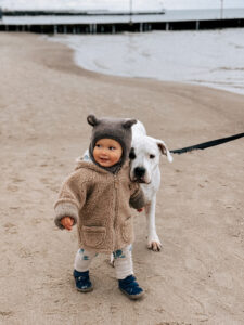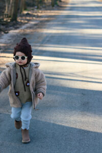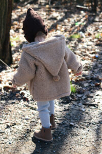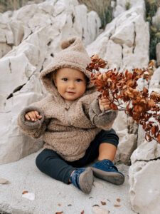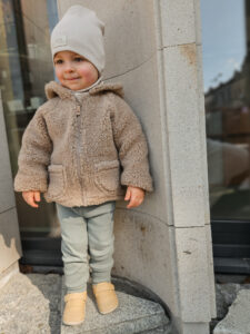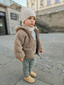 Mīksta un ļoti silta bērnu jaka ar kapuci. Tai ir divas mazas kabatas un rāvējslēdzēja aizdare. Kapuce ir dekorēta ar bumbuli. Tās stilīgo izskatu papildina eko ādas detaļas.